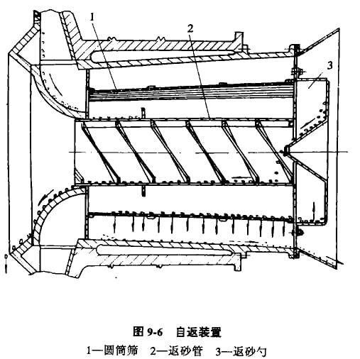 料漿通過格子板孔之后,被簸箕板送入自返裝置的篩上,大塊物料在篩面上運動到另一端的返砂勺內(nèi)。在返砂勺的回轉(zhuǎn)運動中,送入返砂管內(nèi)。返砂管內(nèi)的螺旋片,將大塊物料推送到磨機之內(nèi)再磨。篩下物沿著出料襯套排出機外,進行下道工序處理。返砂勺的構(gòu)造如圖9-7所示。