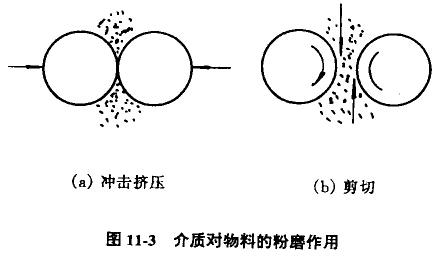 在立式攪拌磨機中,粉磨介質的這種非群體的不規(guī)則運動,其結果造成介質之間撞擊及介質以不同轉速和方向旋轉著,從而對鄰近的物料施加沖擊力、擠壓力和剪切力,如圖11-3所示。物料在這些力的聯(lián)合作用下被細磨或超細粉磨。