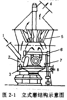 (1)主要結(jié)構(gòu)及功能 圖2-1為立式磨的結(jié)構(gòu)示意圖。立式磨主要由電動(dòng)機(jī)、減速機(jī)、磨輥、磨盤、選粉機(jī)構(gòu)、殼體、加壓裝置、潤滑裝置等部分組成。