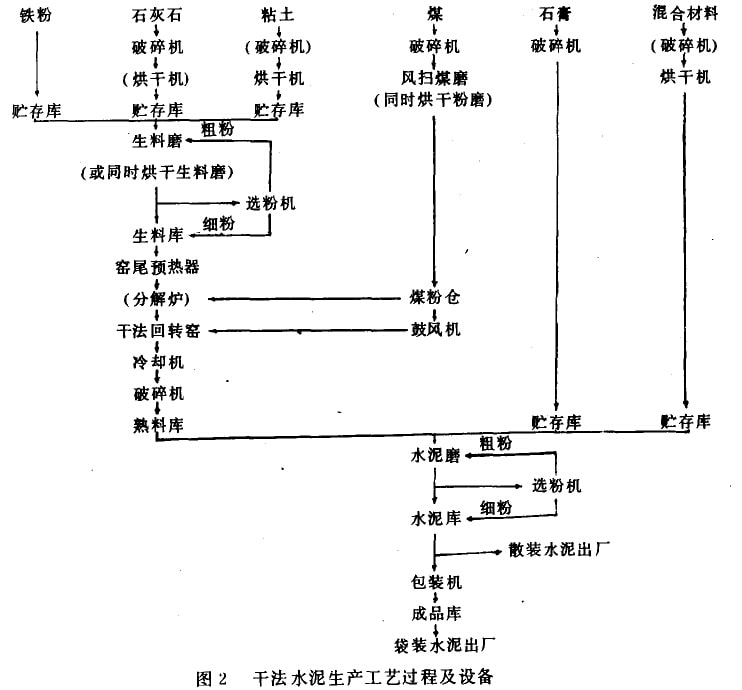 2.干法:采用干法生產(chǎn)時(shí),原料需預(yù)先干燥,然后進(jìn)行磨碎和混合,制得的于細(xì)粉末叫生料粉(一般含水量應(yīng)<1%),再將此生料粉先入預(yù)熱器預(yù)熱,再入窯炮撓。如在懸浮預(yù)熱器與回轉(zhuǎn)窯之間設(shè)一個(gè)分解爐,在分解爐中加入約Go%的燃料,與生料充分混合,使燃料的燃燒過(guò)程和生料的吸熱過(guò)程同時(shí)在懸浮狀態(tài)下極其迅速地進(jìn)億使生料入回轉(zhuǎn)窯時(shí)已完成85-90%的分臟此項(xiàng)技術(shù)稱窯外分解。干法生產(chǎn)的工藝過(guò)程和所使用的機(jī)械設(shè)備見圖2所示。