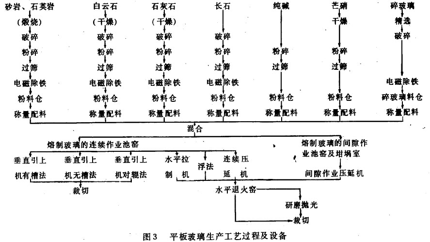平板玻璃生產(chǎn)工藝過(guò)程及機(jī)械設(shè)備見圖3所示。