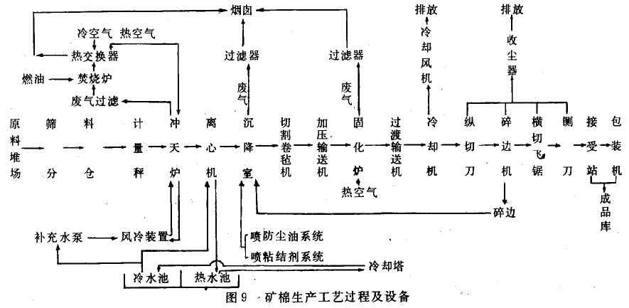 礦棉的主要生產(chǎn)過(guò)程包括:原料、燃料的準(zhǔn)備,沖天爐(或池窯、電爐)熔制,成棉、集棉:固化成型及產(chǎn)品加工等工序。首先把臺(tái)硅、鋁、鈣、鎂等氧化物的天然巖石(如玄武巖、輝綠巖等)和一些堿性原料(如礦渣、白云石、石灰石等),再加上一定的燃料(焦炭),按一定配比送入沖天爐內(nèi),經(jīng)高溫熔融制得熔體。然后把高溫熔仲用離心法甩制成棉,成棉的同時(shí)根據(jù)產(chǎn)品的要求,噴上一定量的核結(jié)劑和防塵油。這些棉在沉降室內(nèi),經(jīng)負(fù)壓吸附作用收集在余屬網(wǎng)帶上,被送出沉降室,這些帶有粘結(jié)劑的棉再被送入到固化爐內(nèi),經(jīng)加壓、加熱而固化定型后,再送到冷加工段。經(jīng)切裁加工成所需的長(zhǎng)、寬尺寸,得到最終產(chǎn)品。其生產(chǎn)工藝過(guò)程及機(jī)械設(shè)備見圖9所示。