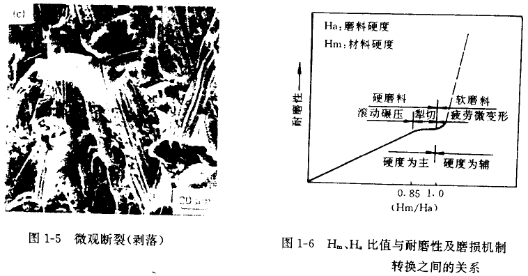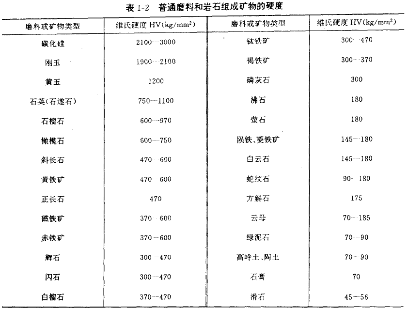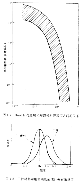 由此可見,當(dāng)磨料硬度遠(yuǎn)遠(yuǎn)大于材料硬度時(shí),磨損嚴(yán)重,磨損與材料硬度無(wú)關(guān);當(dāng)材料硬度接近于磨料硬度時(shí),隨比值的增大,磨 損急劇減小。應(yīng)該指出的是,即使是很軟的磨料,由于沖擊作用或者其中滲有硬磨料等因素,也會(huì)導(dǎo)致工件的磨損。因?yàn)閷?shí)際磨料的硬 度和材料硬度都不是一個(gè)單一的數(shù)值而是一個(gè)分布值(見圖1-8)。因而,即使工件的平均硬度值超過(guò)磨料的平均硬度值,由于磨料與 材料硬度的統(tǒng)計(jì)分布關(guān)系也會(huì)引起磨損。這就說(shuō)明了為什么煤炭的硬度不高,但對(duì)煤炭機(jī)械造成的磨損仍然是十分嚴(yán)重的事實(shí)。表1-2 表示了各種磨料類型及巖石硬度值。