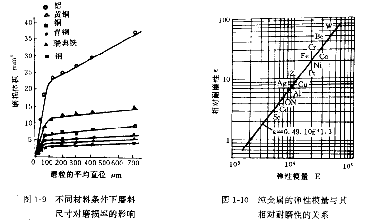 磨料的尺寸粒度對(duì)磨損也有一定的影響(見圖1-9)。當(dāng)磨料在某一臨界尺寸以下時(shí),體積磨損隨磨料尺寸的增加而急劇地按比例增加 ;當(dāng)超過(guò)一臨界尺寸后,磨損增大的幅度顯著降低。