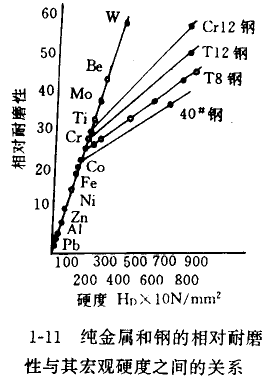 工業(yè)純金屬的耐磨性與其彈性模量成正比(見圖1-10)。但這種關(guān)系不適用于熱處理過(guò)的鋼材,雖然熱處理不改變材料的彈性模量, 但都會(huì)使其耐磨性大大提高。相反,工業(yè)純金屬和不同類型鋼相對(duì)耐磨性與其宏觀硬度成正比(見圖1-11)。熱處理前后鋼的相對(duì)耐磨性 單值地決定于其宏觀硬度,只不過(guò)隨其宏觀硬度增高其耐磨性變化斜率不同而已。耐磨性不僅取決于鋼的硬度、而且取決于它們的成分 ,不同成分的鋼熱處理后雖然具有相同的硬度,但其耐磨性卻不同,這說(shuō)明各種鋼的耐磨性與其宏觀硬度間并不存在單值的對(duì)應(yīng)關(guān)系。