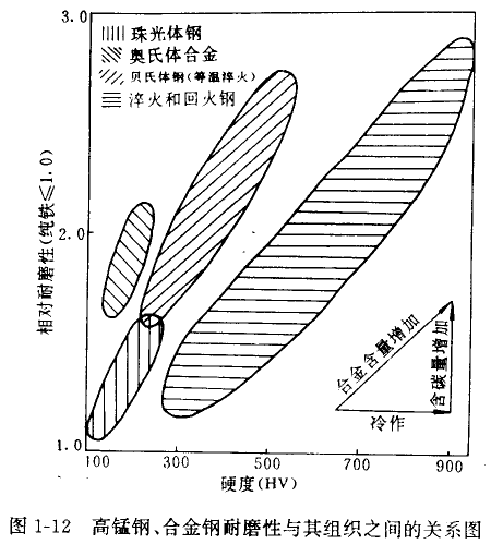圖1-12是高錳鋼、合金鋼的耐磨性與它們組織之間的關(guān)系網(wǎng)。在一定的接觸應(yīng)力、一定的滑動(dòng)磨料磨損試驗(yàn)條件下,具有較高含碳 量的回火馬氏體鋼能獲得較高的耐磨性;相同硬度條件下,貝氏體的耐磨性又比回火馬氏體的耐磨性高。這時(shí)的高錳鋼只相當(dāng)于回火馬 氏體和貝氏體鋼的中等耐潛水平;珠光體的硬度最低,耐磨性最差,相同距度的田氏體與珠光體組織相比,奧氏體的耐磨性又高得多。 殘余奧氏體對(duì)鋼的耐磨世也是有影響的。很多學(xué)者認(rèn)為,在馬氏體一碳化物的混合組織中存在者殘余奧氏體.對(duì)提高抗廟料磨損性能是 有益的。殘余奧氏體在其中起的作用一般認(rèn)為是: