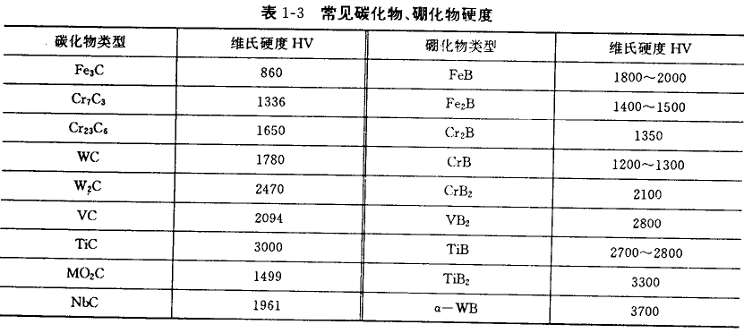 在碳化物中,M3C型結(jié)構(gòu)的硬度較低,對(duì)耐磨性貢獻(xiàn)小,馬氏體和合金工具鋼中碳化物多屬于M3C型結(jié)構(gòu)。高鉻鑄鐵中碳化物主要是 (FeCr)C3型碳化物,也有少量的(FeCr)6C、(FeCr)23C6型碳化物,他們的硬度均較M3C型為高,對(duì)耐磨性貢獻(xiàn)也大。在硬質(zhì)合金 中的碳化物大多是WC、TiC、ZrC、Nh、VC等。它們都具有極高的硬度和高溫穩(wěn)定性,是硬質(zhì)合金具有高的耐湃性利紅硬件的土要原因。 此外,很多合金元素還可與B生成Fe2B、TiB,CrB等同硬度的刪化物,對(duì)材料的耐磨性也具有較大的影響。常見的碳化物、硼化物硬度 見表1-3。