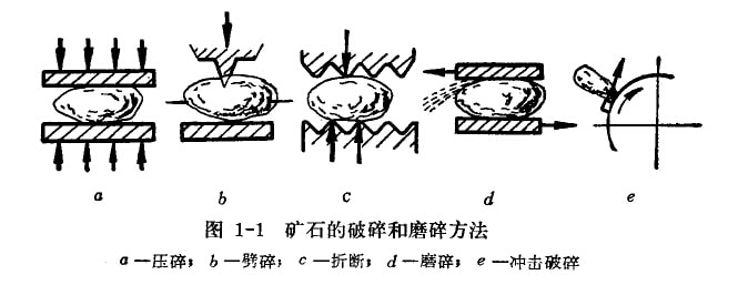 (4)磨碎(圖1—1d):礦石與運(yùn)動的表面之間受一定的壓力和剪切力作用后,其剪應(yīng)力達(dá)到礦石的剪切強(qiáng)度限時(shí),礦石即被粉碎。磨碎的效率低,能量消耗大。