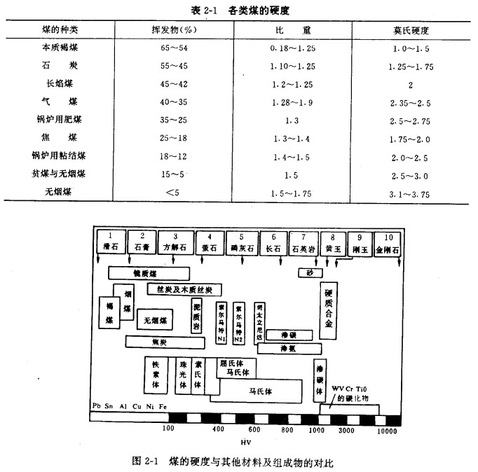 對磨損來說,硬度是重要的因素,煤的硬度是較低的,根據(jù)普拉托諾夫資料,各種煤的硬度如表2-1所示.煤的硬度與標(biāo)準(zhǔn)礦物及某些金屬材料和鋼中組成物的對比見圖2-1。