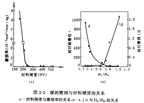 (1)煤與其他磨料一樣具有共同的磨料磨損性。Ha/Hm=0.64為轉(zhuǎn)折點(diǎn),(式中Ha為磨料硬度.Hm為金屬材料硬度),當(dāng)Ha/Hm>0.64,磨料硬度不變時,隨材料的硬度降低,磨損急劇上升;當(dāng)Ha/Hm<0.64,磨料硬度不變時,隨材料硬度提高,磨損率趨近于零。