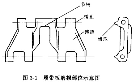 在考慮提高零件使用壽命時,應(yīng)首先從改進零件的結(jié)構(gòu)設(shè)計開始。不合理或不完美的設(shè)計往往會使磨損大大加劇,使用壽命明顯降低。反之,有時在結(jié)構(gòu)設(shè)計上稍作改進,往往會很容易或明顯地提高零件的耐磨性。改善零件結(jié)構(gòu)的設(shè)計方法是:應(yīng)用摩擦學(xué)知識,主要是磨料磨損規(guī)律知識,合理改變零部件結(jié)構(gòu)設(shè)計,即通過對磨損零件摩擦學(xué)系統(tǒng)分析以后,從改善磨損條件出發(fā),適當(dāng)改變零件的幾何形狀、配合方式以及加大其工作部分尺寸,或用特殊的工藝方法。這些參數(shù)改變后,既能滿足設(shè)備正常運轉(zhuǎn),又不致增加過多消耗,使耐磨性大大提高。這已經(jīng)被許多應(yīng)用實例所證實。例如:50年代,拖拉機履帶板都是五孔型履帶板.后改為七孔履帶板,將易磨損部位的節(jié)銷厚度適當(dāng)增加,壽命比五孔的提高了,得到普遍采用,如圖3-1所示。
