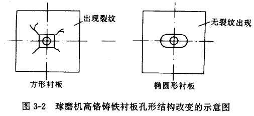 近幾年來,高格鑄鐵材料在耐磨零件中得到廣泛地應(yīng)用。盡管這種材料有很高的硬度和耐磨性,然而它比高錳鋼及低臺金鋼等材料要脆得多,如果結(jié)構(gòu)設(shè)計不當(dāng),往往出于開裂造成早期失效。比如高鉻鑄鐵制造的球磨機襯板,易由中間方孔四角裂紋擴張開裂,后改為橢圓形孔,并注意安裝及使用條件,減少了應(yīng)力集中和開裂,使高鉻鑄鐵襯板,在球磨機中得到成功的應(yīng)用,如圖3-2所示。
