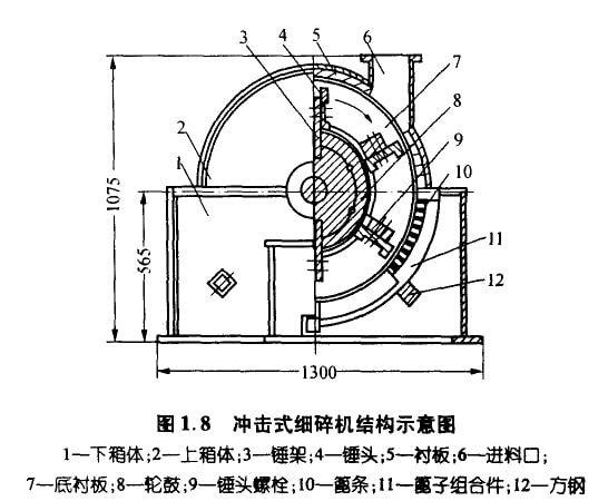 沖擊式細碎機是—種錘式破碎機,具有產(chǎn)品粒度細、破碎比大、產(chǎn)量高等特點,適于將各種粒度小于60mm的中硬物料細碎到5mm 以下(占產(chǎn)量的80%左右)。合肥水泥研究設(shè)計院設(shè)計的CXL-ø800mm×300mm沖擊式細碎機的結(jié)構(gòu)如圖1.8所示。