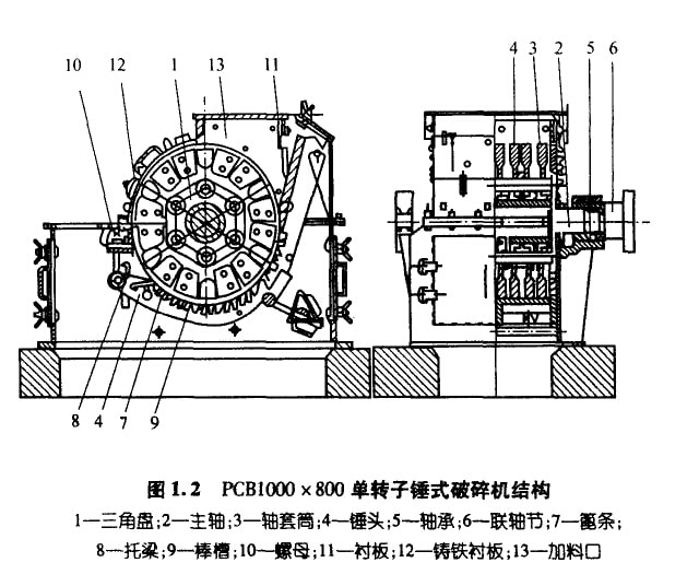 錘式破碎機按回轉(zhuǎn)軸的軸數(shù)分類,有單轉(zhuǎn)子和雙轉(zhuǎn)子兩種型式;按轉(zhuǎn)子回轉(zhuǎn)方向分類,有可逆式和不可逆式之區(qū)別。錘式破碎機的捶 頭結(jié)構(gòu)和村質(zhì)是決定產(chǎn)品質(zhì)量和破碎效率的重要部件.為了延長錘頭的使用壽命,一般在錘頭的兩端均開設(shè)安裝孔,以便調(diào)頭安裝或正 反面調(diào)換使用。圖1.2和圖1.3分別為單轉(zhuǎn)子和雙轉(zhuǎn)子錘式破碎機的結(jié)構(gòu)原理圖。雙轉(zhuǎn)子捶式破碎機設(shè)有‘v”形篦條,在一 對轉(zhuǎn)子的上錘頭之間構(gòu)成了一個預(yù)破碎腔,大塊物料在進入兩回轉(zhuǎn)軸形成的兩個細碎腔之前,先進行預(yù)破碎,因此,這種破碎機具有破 碎比大、喂料均勻、兼有預(yù)碎和細碎兩段破碎功能等特點,常被用作石灰石一段破碎系統(tǒng)。