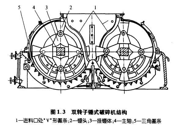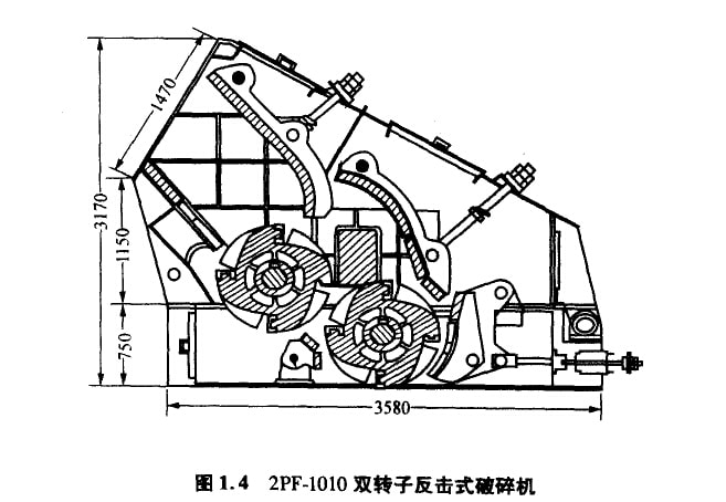 2PF-1010雙轉(zhuǎn)子反擊式破碎機可用來破碎游離石英量<7%,水分<10%的石灰石、石膏和泥灰?guī)r等抗壓強度<140MPa的物料,如圖 1.4所示。