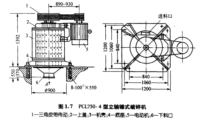 立軸捶式破碎機由上蓋、機殼、立軸轉(zhuǎn)子、底座和傳動裝置等部分組成(參見圖1.7)。上蓋一側(cè)設(shè)有喂料口,機殼內(nèi)裝有反擊板,中 心立軸轉(zhuǎn)子對稱布置有板錘或鏈錘,傳動采用異步電動機和三角皮帶,底座下部設(shè)有出料溜子。物料均勻喂入近料口,自由墜落過程中 被高速錘頭錘擊,物料在錘頭與反擊板之間又相互沖擊,被粉碎物料由底部排出。