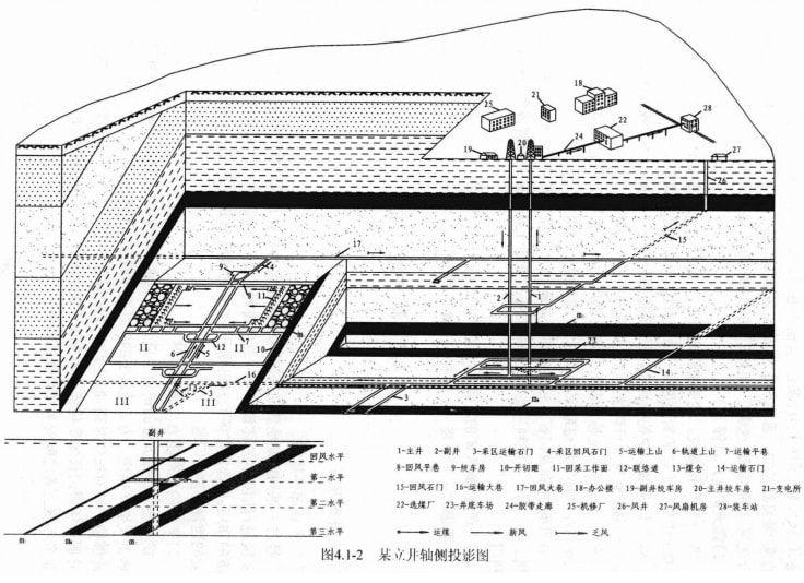 圖4.1-2是某礦井(立井)生產(chǎn)過(guò)程的軸側(cè)投影圖。從圖中可以看出,該礦井開(kāi)采三個(gè)煤層。為了開(kāi)采和運(yùn)輸煤炭,需要開(kāi)掘的井巷有:主井、副井、并底車場(chǎng)、石門、運(yùn)輸大巷、回風(fēng)大巷、采區(qū)上山、煤倉(cāng)、運(yùn)輸平巷、回風(fēng)平巷,回來(lái)工作面等。從井下提運(yùn)到地面的煤,需要經(jīng)過(guò)加工后裝車外運(yùn),故還需要在地面工業(yè)場(chǎng)地布置主副井井架、浴室燈房聯(lián)合建筑、皮帶走廊、選煤廠、機(jī)修廠、辦公樓等地面建構(gòu)筑物。