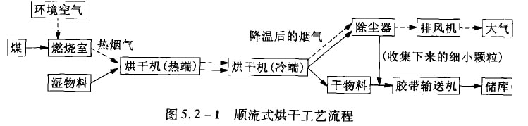 順流式烘干工藝流程如圖5.2-1所示。在順流式烘干工藝流程中,物料運動方向與熱煙氣的流向是一致的。