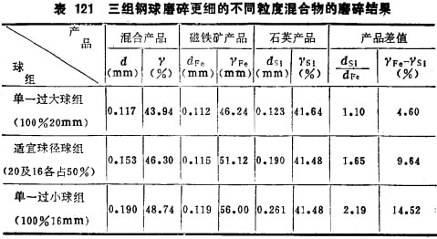 按照前面的試驗研究方法,在磨碎混合礦料前,先用單級別純礦物進行試驗,確定1~0.5mm石英最適宜的球徑為20mm, 0.5~0.3mm磁鐵礦最適宜的球徑為16mm。因此,對此混合礦料而言,最適宜的球徑配比為20mm球及16mm球各占50%;100%20tnm球即為過大球組;100%的16mm球組即為過小球組。三組球的磨礦條件相同,磨碎試驗的結(jié)果列于表121所示。