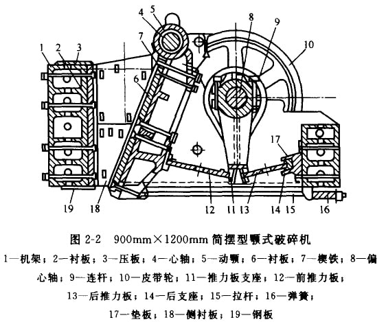 (1)顎式破碎機。顎式破碎機是一種間歇工作的破碎機械。它適用于堅硬或中堅硬礦石的粗碎和中碎。其結(jié)構(gòu)簡單,制造容易,工作 可靠,維護和調(diào)節(jié)方便,價格便宜。但生產(chǎn)率低,破碎比小,工作時振動大,給礦不均勻時易堵塞,產(chǎn)品粒度不均勻,不適于片狀和平 板狀礦石的破碎。在工業(yè)上廣泛應(yīng)用的有簡單擺動和復(fù)雜擺動兩種結(jié)構(gòu)型式的顎式破碎機。圖2—2是國產(chǎn)900mm×1300mm簡 擺型顎式破碎機。