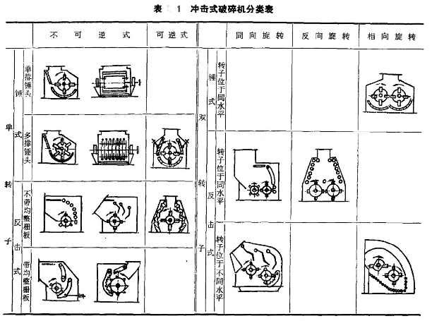 沖擊式破碎機(jī)的結(jié)構(gòu)型式很多,其分類(lèi)方法見(jiàn)表1。