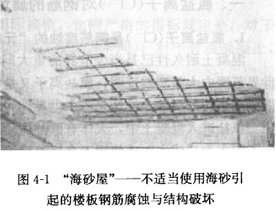 我國大規(guī)模經(jīng)濟(jì)建設(shè)的飛速發(fā)展,使沿海地區(qū)陸續(xù)出現(xiàn)河砂短缺現(xiàn)象。我國沿海地區(qū)愉挖、濫用海砂現(xiàn)象出來已久,1999年同土資源部發(fā)布了《關(guān)于加強(qiáng)海砂開采管理的通知》,提出在保護(hù)海洋環(huán)境的前提下,允許有序地開發(fā)海砂資源,以解決建筑用砂問題。這本是“變廢為寶”的好事,然而,不合理地使用海砂,卻會給國家和民眾帶來麻煩乃至災(zāi)難。這是因為海砂中含鹽,會腐蝕鋼筋、破壞混凝土結(jié)構(gòu)。如果使用不合格海砂,建筑物就會發(fā)生結(jié)構(gòu)破壞甚至跨塌(一般可在1-15年內(nèi)暴露出來)。一旦遭遇地震,這樣的建筑物可能最先倒塌。所謂“海砂屋”就是指使用了不合格海砂所建造的建筑物(公用、民用或基礎(chǔ)設(shè)施),是屬于質(zhì)量低劣的建筑(圖4-1)。