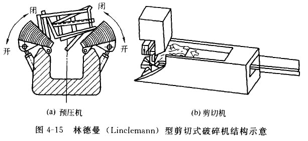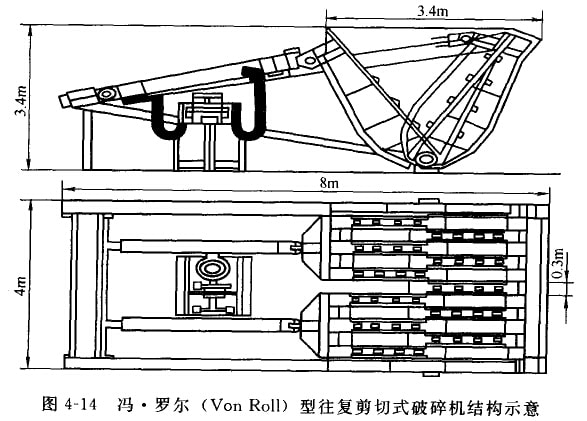 目前廣泛使用的剪切破碎機(jī)主要有馮·羅爾(Von Roll)型往復(fù)剪切式破碎機(jī)、林德曼(Linclemann)型剪切式破碎機(jī)從旋轉(zhuǎn)剪切式破碎機(jī)等。
