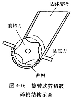 圖4-16所示為旋轉(zhuǎn)式剪切破碎機(jī)結(jié)構(gòu)示意。它內(nèi)固定刃(1-2片)和旋轉(zhuǎn)刃(3-5片)組成。固體廢物給人料斗,依靠高速轉(zhuǎn)動(dòng)的旋轉(zhuǎn)刃和固定刃之間的間隙擠壓和剪切破碎,破碎產(chǎn)品經(jīng)篩縫排出機(jī)外。該機(jī)的缺點(diǎn)是當(dāng)混人硬度較大的雜物時(shí),易發(fā)生操作事故。這種破碎機(jī)適合家庭生活垃圾的破碎。