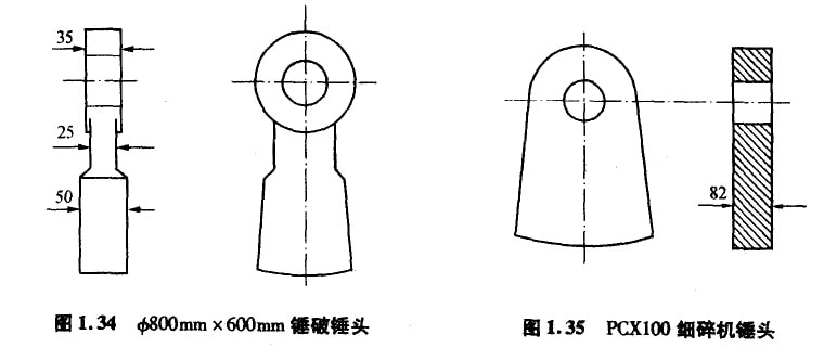 例如,老型號錘式破碎機錘頭的結(jié)構(gòu)形狀如圖1.34,立軸式破碎機錘頭也類似。當(dāng)初設(shè)計思想是盡可能減輕非磨損部位(錘柄)的重量,節(jié)約材料,降低成本。所以,錘柄部位很薄,只有采用高錳鋼或低碳合貧鋼材質(zhì)才能保證其不斷裂,但耐磨性很差,無法用于熟料的破碎。用高硬度耐磨材料制作該錘頭,很容易斷裂,無法可靠應(yīng)用。