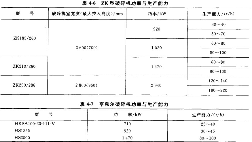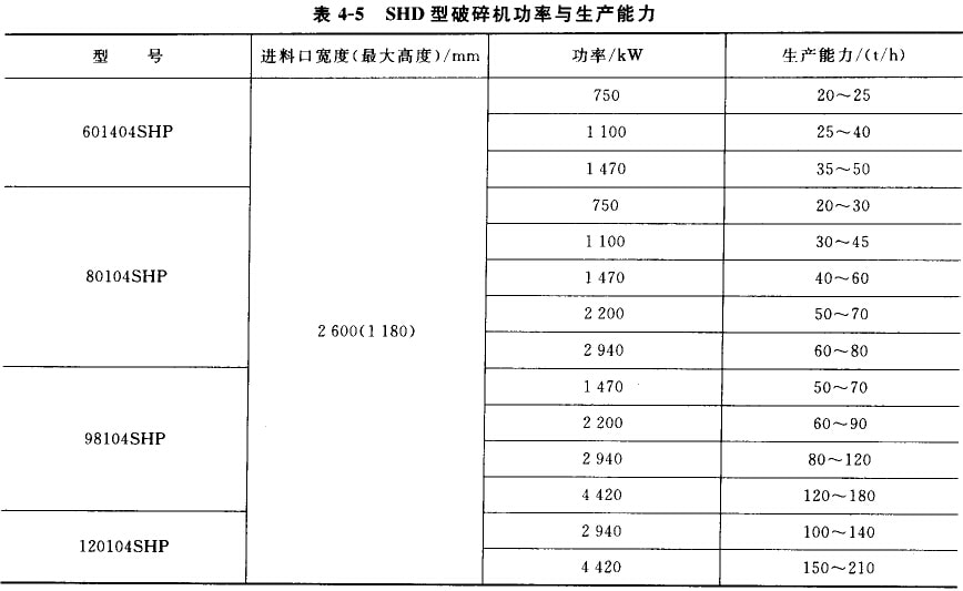 立式破碎機世界上使用較少,90%以上的用廣都選用臥式。亨息爾公司的臥式破碎機與美國紐維爾公司的產(chǎn)品相似,這里不再贅述,其功率與作產(chǎn)能力見表4-7。