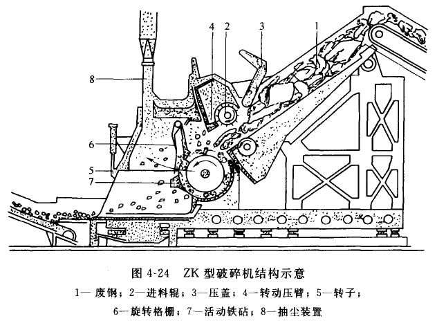 左下方設(shè)有活動鐵砧,可以調(diào)節(jié)轉(zhuǎn)于錘頭勺砧之間的間隙,從而獲得預(yù)期尺寸的破碎鋼片。旋轉(zhuǎn)格柵起到篩和不可破碎物排放門的雙重作用。③轉(zhuǎn)于的旋轉(zhuǎn)方向嶼供料方向一致,物料進入破碎機后,首先是保持在破碎腔上方?善扑槲镞M入轉(zhuǎn)子與砧之間后被擊破撕裂成小塊,不可破碎物(重型廢鋼)將在轉(zhuǎn)于的驅(qū)動廠撞向活動格柵,使其向后轉(zhuǎn)動,從而離開了破碎機。這是ZK型破碎機的最大特點。ZK型破碎機結(jié)構(gòu)如圖4-24所示,其功率與生產(chǎn)能力如表4-6所示。