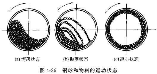 圖4-25為球磨機(jī)構(gòu)造和丁作原理示意。它由圓柱形筒體、筒體兩端端蓋、中空軸頸、軸承和傳動(dòng)大齒圈組成。在筒體內(nèi)裝有鋼球(直徑為25-150nml)。其裝入量為筒體有效容積的25%-50%,筒體兩端的中空袖頸有兩個(gè)作用:一是應(yīng)軸頸的支承作用,使球墨機(jī)全部重量由中空軸須傳給軸承和機(jī)座;二是起給料和排料的漏斗作用,電動(dòng)機(jī)通過(guò)聯(lián)軸器和小齒輪帶動(dòng)大齒圈和筒體緩緩轉(zhuǎn)動(dòng)。筒體內(nèi)壁設(shè)有襯板,侖同時(shí)起到防止筒體磨損和提升鋼球的作用。當(dāng)筒體轉(zhuǎn)動(dòng)時(shí),鋼球和破碎物料在摩擦力、離心人和襯板的共同作用下,被襯板帶動(dòng)提升。征在升到一定高度后,由于自身重力的作用處得鋼球和物料產(chǎn)土自由瀉路和拋落(圖4-26),從而對(duì)筒體內(nèi)底腳區(qū)的物料產(chǎn)個(gè)外擊和研磨作用。物料粒徑達(dá)到要求后出風(fēng)機(jī)抽出。