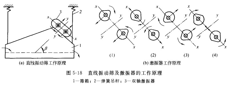 圖5-18(a)為直線振動(dòng)篩工作原理。圖中篩箱1用四根彈簧吊桿2懸掛在機(jī)架或橫梁上(也有采用彈簧支承在基礎(chǔ)上),雙軸激振器3安裝在篩箱上,依靠激振器,實(shí)際上是由兩個(gè)單不平衡重激振器組合而成。因此,當(dāng)兩個(gè)單八平衡重激振器的兩根軸同步異向回轉(zhuǎn)時(shí),在各瞬時(shí)位置中,兩根軸上不平衡重所產(chǎn)生的離心慣性力,沿x方向的分力總是互相抵消,而沿y方向的分力總是互相疊加。因此,形成了單一的沿y方向的激振力,依靠此力驅(qū)動(dòng)篩箱做自線住復(fù)振動(dòng)。如圖5-18(b)所示,當(dāng)雙不平衡重量運(yùn)轉(zhuǎn)到位置(1)和(3)時(shí),共離心力完全疊加,激振力最大;在轉(zhuǎn)到位置(2)和(4)時(shí),其離心力完全抵消,激振力為零。直線振動(dòng)篩一般是遠(yuǎn)離共振區(qū)工作的,這時(shí),篩箱振動(dòng)的方向和激振力的方向相反,篩箱斜向振動(dòng)時(shí),物料被斜向拋起后又落下,并進(jìn)行篩分。
