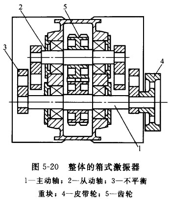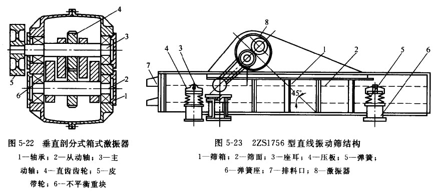 DS系列直線振動(dòng)篩采用整體的箱式激振器(見(jiàn)圖5-20)。激振器的箱體用35號(hào)鑄俐制成。箱體內(nèi)槳有主動(dòng)軸1和從動(dòng)軸2,軸上各有一對(duì)重 量相向的不平衡員塊(偏心塊)3,皮帶輪4帶動(dòng)土軸問(wèn)轉(zhuǎn),通過(guò)一對(duì)齒輪5使從動(dòng)軸做反向心同歲的回轉(zhuǎn),利用個(gè)平衡玉回轉(zhuǎn)時(shí)產(chǎn)生的離 心力使激振器產(chǎn)牛定向的激扼力。該激振器具有以下結(jié)構(gòu)特點(diǎn)。①平衡重塊成對(duì)地布量在激銀器箱體外面。這樣可使箱內(nèi)結(jié)構(gòu)緊湊;便 于調(diào)整不平衡重塊上面的配重柱塞,以改變篩稻的振幅;同時(shí),也避免不平衡重塊回轉(zhuǎn)時(shí),碰擊箱體內(nèi)的潤(rùn)滑油而引起箱體發(fā)熱。齒輪 對(duì)安裝在箱體內(nèi),使其潤(rùn)滑可靠,傳動(dòng)平穩(wěn)。②制成整體式,沒(méi)有別分面,在承受激振力時(shí)較合理,制造簡(jiǎn)單,但拆裝困難。