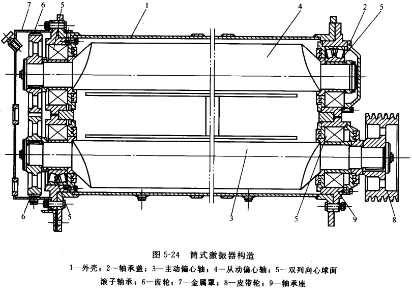 座式直線振動(dòng)篩采用筒式激振器,其構(gòu)造如圖5-24所示。在帶三角形側(cè)板的扁圓筒形外殼1上裝有軸承座9,兩根偏心軸3、4通過(guò)一對(duì)雙列向心球面滾子軸承5安裝在軸承座上。皮帶輪8帶動(dòng)主動(dòng)偏心軸3并經(jīng)一對(duì)齒輪6使從動(dòng)偏心軸4做反向同步回轉(zhuǎn),從而產(chǎn)生定向的激振力。在一對(duì)齒輪6一側(cè)有金屬罩7,內(nèi)裝潤(rùn)滑油,用以潤(rùn)滑齒輪和同側(cè)的該動(dòng)軸承。皮帶輪側(cè)的軸承各成封閉油腔,采用潤(rùn)滑脂潤(rùn)滑。齒輪側(cè)的波動(dòng)軸承和皮帶輪側(cè)的滾動(dòng)軸承采用迷宮式密封。激振器通過(guò)螺栓固定在篩箱上,并用鉸孔螺栓定位。