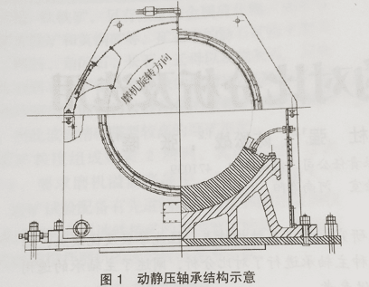 最初磨機規(guī)格較小時,基本上都是用此類主軸承。其工作原理是,磨機還沒運轉(zhuǎn)時,先啟動潤滑站的高壓泵,高壓油進入到主軸承的油腔中頂起中空軸,在軸承和中空軸之間形成一層油膜,當磨機筒體開始旋轉(zhuǎn)時,利用軸承的楔形油腔產(chǎn)生的動壓效應,在軸承和中空軸之間形成一層穩(wěn)定的油膜,同時潤滑站的高壓系統(tǒng)停止供油,低壓系統(tǒng)向主軸承的頂部供 低壓油,低壓油灑在旋轉(zhuǎn)的中空軸上,對已經(jīng)形成的油膜進行油量補充。動靜壓軸承的結(jié)構(gòu)如圖1所示。