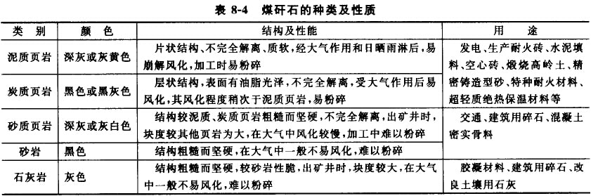 按巖石特性不同,煤殲石可以分為泥質(zhì)頁(yè)巖、炭質(zhì)頁(yè)巖、砂質(zhì)頁(yè)巖、砂巖及石灰?guī)r,性能及用途如表8-4所示。