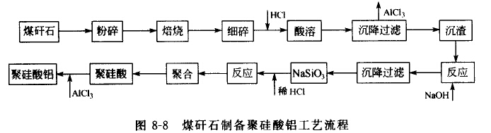 在利用煤矸石中的Al2O3制取AlCl3的同時(shí),也能利用其中的SiO2生產(chǎn)出聚硅酸,將AlCl3與聚硅酸混合即可得到聚硅酸鋁混凝劑,工藝流程如圖8-8所示。