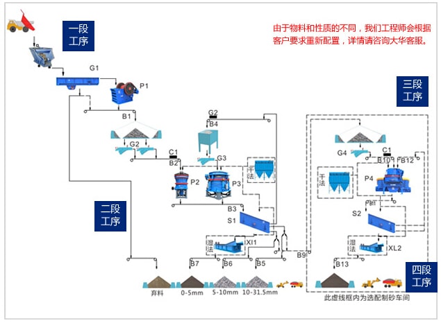 花崗巖大塊物料經(jīng)料倉由振動給料機均勻喂料,輸送到顎式破碎機進行粗碎,粗碎后的物料經(jīng)振動篩篩分后,由皮帶輸送機輸送至反擊式破碎機或圓錐破碎機進行中細碎。
