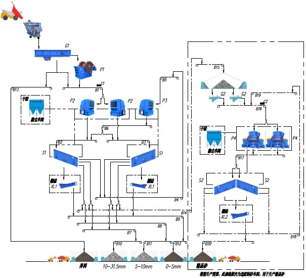 該生產(chǎn)線加工工藝主要適用于800t/h石灰石(白云巖)類中等以下硬度物料的加工破碎,將經(jīng)過爆破處理或開挖洞采的毛料通過棒條給料機均勻的供給顎式破碎機破碎,經(jīng)顎式破碎機破碎后的半成品物料通過皮帶機輸送給反擊式破碎機進行二次破碎,經(jīng)反擊破二次破碎后的混合骨料經(jīng)過皮帶機輸送至一篩車間進行分級篩分,篩分過后將大于用戶需要的大顆粒物料通過皮帶機輸送至細碎反擊式破碎機再進行破碎,破碎后的物料再通過皮帶機也輸送至一篩車間進行篩分,篩分過后的不同顆粒級別的成品通過成品出料皮帶機輸送至成品料倉。不符合要求的大顆粒再次返回細碎反擊式破碎機進行循環(huán)破碎。