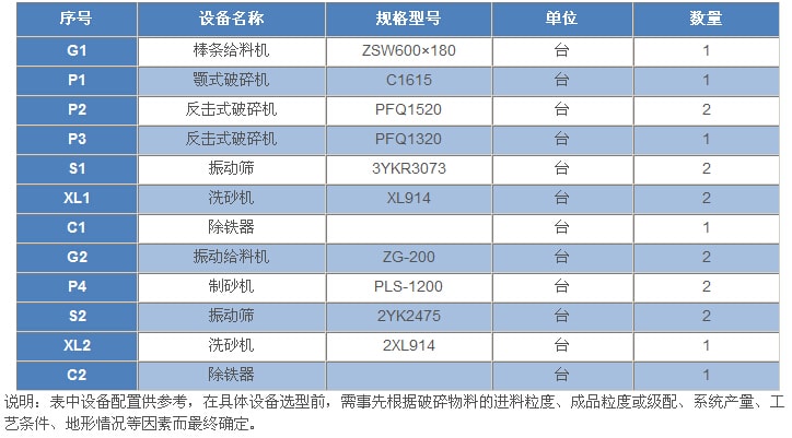 800t/h---石灰石(白云巖)類巖石的砂石骨料生產(chǎn)工藝設(shè)備配置表