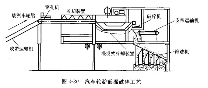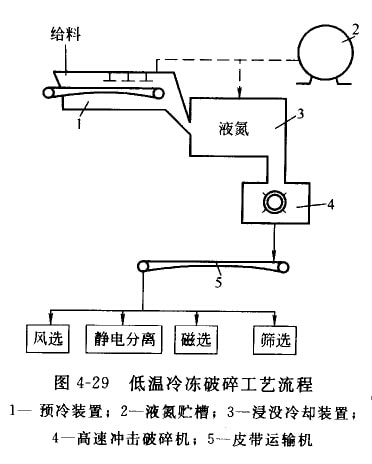 對于一些在常溫下難以破碎的固體廢物如汽車輪胎、包覆電線、廢家用電器等,可以利用其低溫變脆的性能而有效地施行破碎,也可 利用不同廢物脆化溫度的差異進行在低溫下選擇性破碎。低溫破碎通常需要配置制冷系統(tǒng),液氮是常用的制冷劑,因液氮制冷效果好、 無毒、無爆炸性且貨源允足。但是所需的液氮量較大,是制備液氮需要消耗大量的能旦,故出于經(jīng)濟上的考慮,低溫破碎對象僅限于常 溫下破碎機回收成本高的合成材料,如橡膠和塑料。