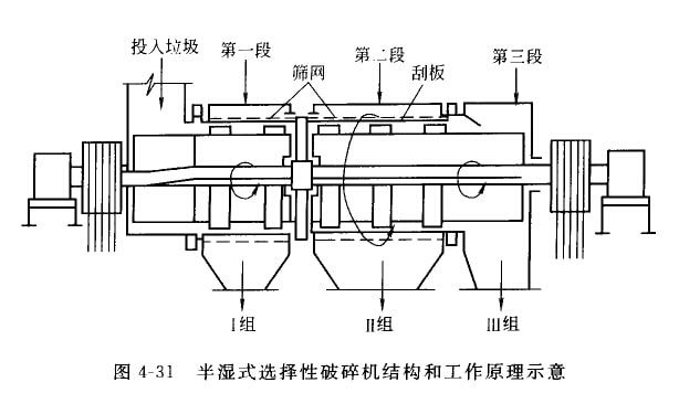半濕式選擇性破碎分選是利用城市垃圾巾各種不同物質(zhì)的強度和脆性的差異,在一定濕度下破碎成不同粒度的碎塊,然后通過不同師 孔加以分離的過程。由于該過程是在半濕(加少量水)狀態(tài)下,通過兼釘選擇什破碎和篩分兩種功能的裝置小實現(xiàn)的,因此,把這種裝置 稱為半濕式選擇性破碎分選機。