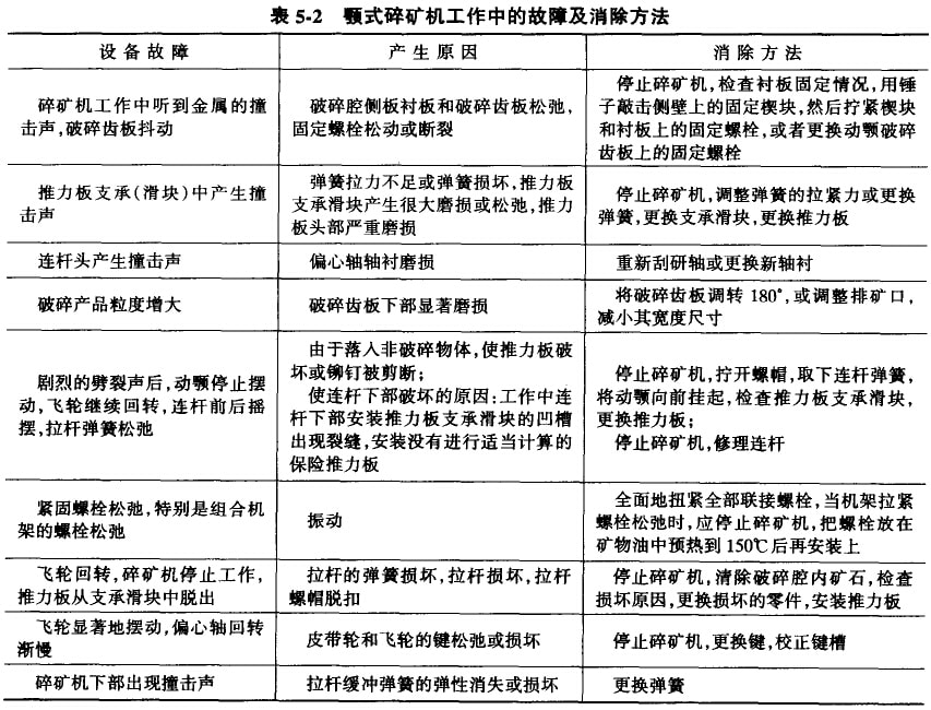 顎式碎礦機在使用操作中,必須注意經(jīng)常維護和檢修。在碎礦車間中,顎式碎礦機的工作條件是非常惡劣的,設備的磨損問題是不可避免的。但是,機器零件的過快磨損,甚至斷裂,往往都是由于操作不正確和維護不周到造成的。所以,正確的操作和精心的維護(定期檢修)是延長機器的使用壽命和提高設備的運轉(zhuǎn)串的重要途徑。在日常維護工作中,操作人員要能正確地判斷設備故障,推確地分折原因,從而迅速地采取消除方法。領式碎礦機常見的設備故障、產(chǎn)生原因和消除方法見表5-2。