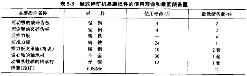 在一定條件下工作的設備零件,其磨損情況通常是有一定規(guī)律的,工作了一定時間以后,就需要進行修復或更換,這段時間間隔叫做零件的磨損周期(或稱為零件的使用期限)。顎式碎礦機主要易磨損件的使用壽命和最低儲備量的大致情況可參見表5-3。