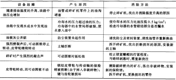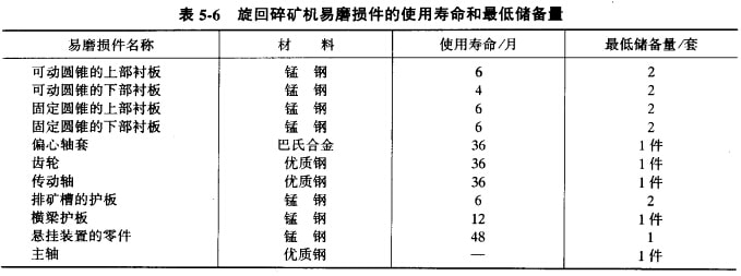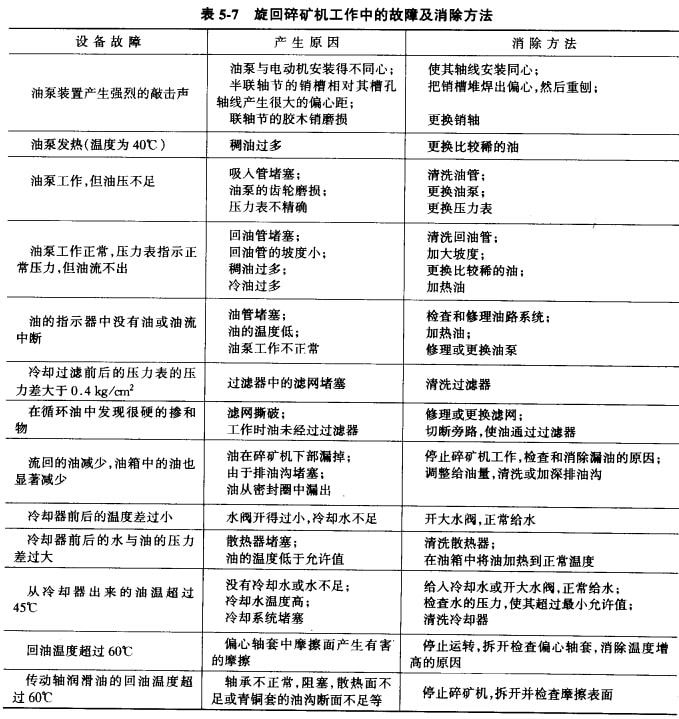 旋回破碎機(jī)主要易磨損件的使用壽命和最低儲(chǔ)備量可參見(jiàn)表5-6;旋回破碎機(jī)工作中產(chǎn)生的故障及其排除方法可參見(jiàn)表5-7。