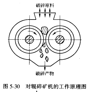 對(duì)輥破碎機(jī)的工作原理如圖5-30所示。物料從上面加入破碎機(jī),兩個(gè)圓輥相向旋轉(zhuǎn),由于物料與輥面的摩擦力將物料卷入破碎腔小,被輥?zhàn)铀鶋核。已破碎的礦石,在重力作用下,從兩個(gè)輥?zhàn)娱g的間隙處排出。