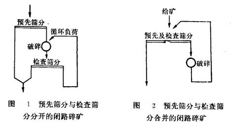 在一個破碎段中,如果沒有檢查篩分作業(yè)則叫開路破碎。如果有檢査篩分作業(yè)就叫閉路破碎。在同一個破碎段中可以同時有預先篩分作業(yè)和檢查篩分作業(yè)。這兩個作業(yè)可以是分開進行的如圖1,也可以是合并進行的如圖2。