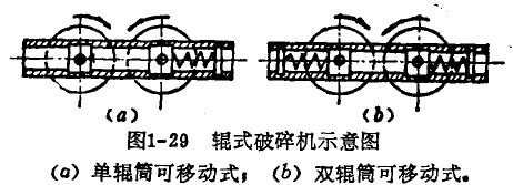 雙輥筒的輥式破碎機(jī)又可分為單輥可移動(dòng)式和雙輥可移動(dòng)式兩種(圖1-29)。輥筒的驅(qū)動(dòng)分單輥驅(qū)動(dòng)(由一個(gè)電動(dòng)機(jī)和一套傳動(dòng)系統(tǒng)組成)和雙輥驅(qū)動(dòng)(兩個(gè)輥簡(jiǎn)分別由兩個(gè)電動(dòng)機(jī)和兩旁傳動(dòng)系統(tǒng)組成)。