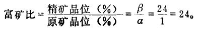 精礦品位(β)和原礦品位(α)之比叫富礦比。這個(gè)比值表示精礦中和用成分的含量比在原礦中有用成分的含量提高的倍數(shù)。如硫化銅礦,原礦中銅品位為1%,精礦中銅品位為24%,其富礦比為: